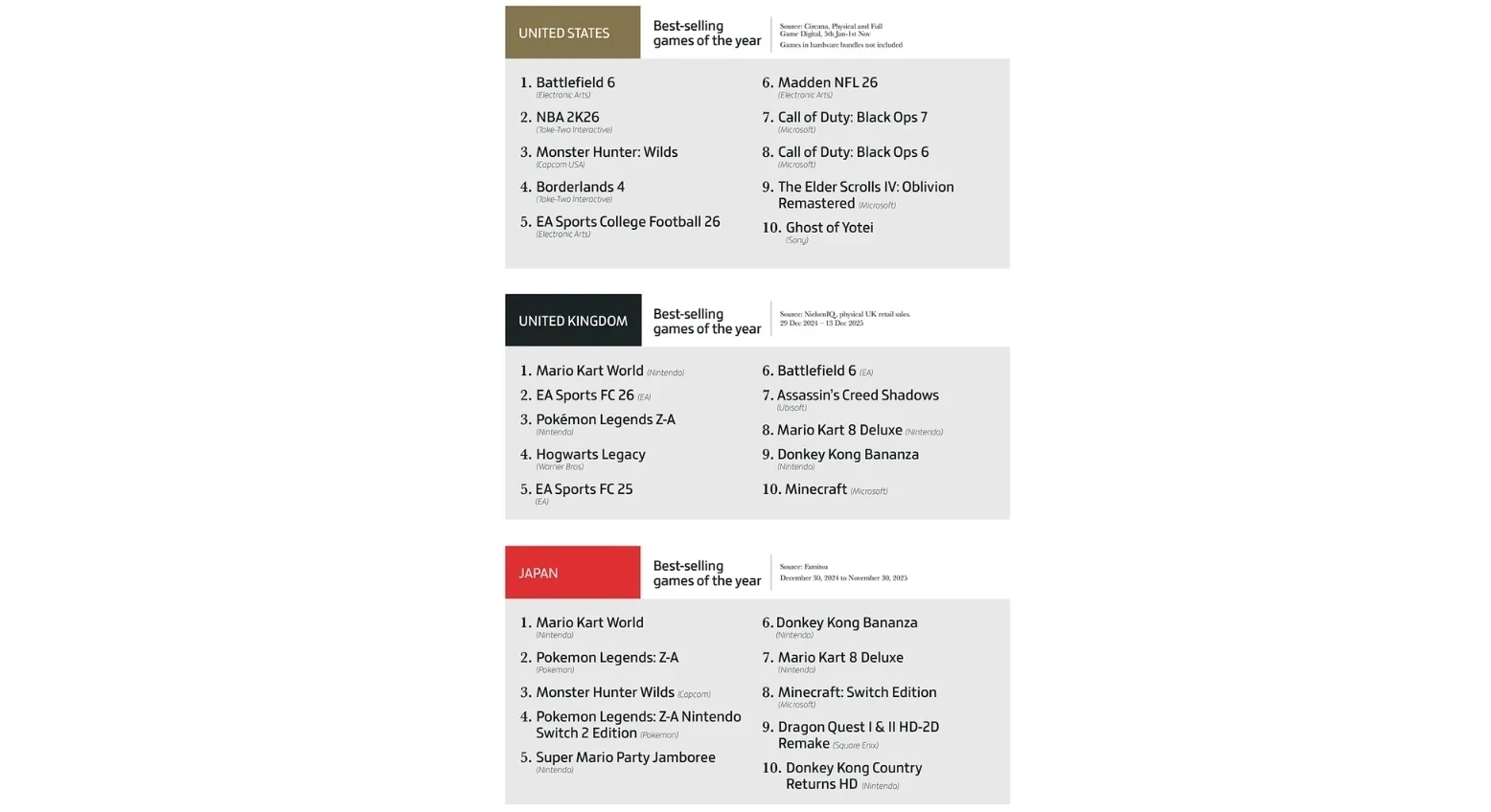 А что насчёт самых продаваемых игр в разных странах? Посмотрим на примере США, Японии и Соединённом королевстве.