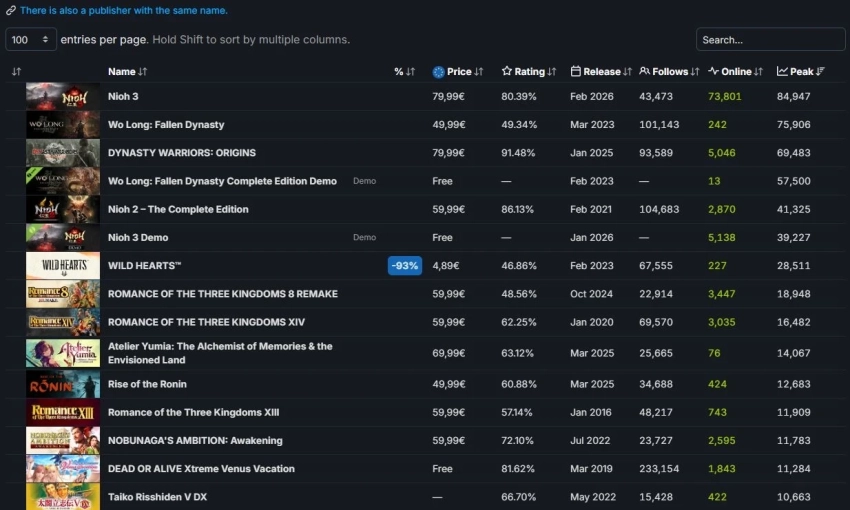 И это рекорд для всех игр издательства Koei Tecmo. Прошлый (75 906) принадлежал Wo Long: Fallen Dynasty, и ролевое экшен установил его почти три года назад.