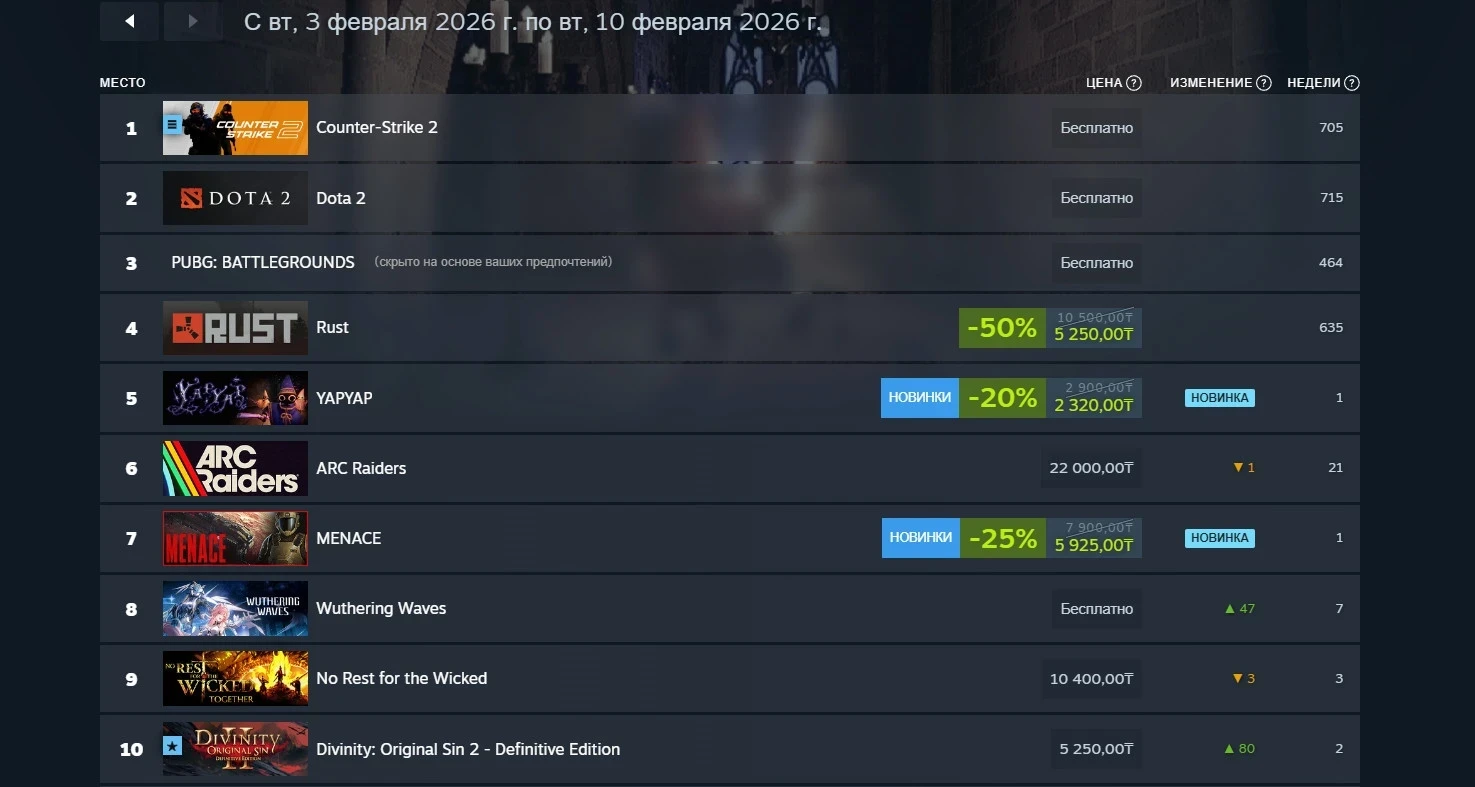 MENACE также вошла и в первую десятку чарта российского сегмента Steam, заняв седьмую строчку. А на пятом месте расположилась ещё одна новинка недели — кооперативная YAPYAP, которая может похвастаться поддержкой голосовых команд. Wuthering Waves также вошла в топ-10 — для достижения восьмой строчки понадобилось подняться на 47 позиций.