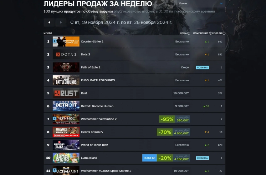 В топе есть лишь одна новинка — милая кооперативная песочница Luma Island закрывает первую десятку. Сразу за ней следует нашумевший экшен Warhammer 40,000: Space Marine 2. К слову, на седьмом месте также есть Warhammer: Vermintide 2 — кооперативную игру можно купить лишь за 74 рубля по крупной скидке.