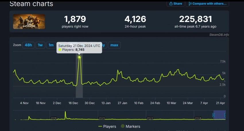 Это вполне обычная цифра онлайна для игры, которая держится последние месяцы. Лишь в декабре For Honor привлекла более восьми тысяч одновременных игроков, что стало рекордом за 2024 год. Если же взять все платформы и магазины, на которых доступна For Honor, то онлайн должен быть значительно выше.