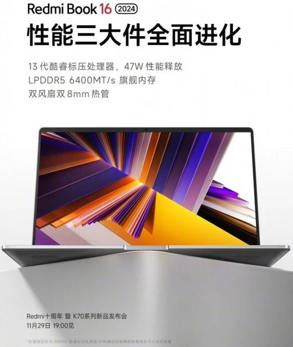 Ноутбук Redmi Book 16 (2024) предложит 12-ядерный процессор Intel Core i5-13500H с частотой до 4,7 ГГц и TDP 47 Вт, а также обновлённую систему охлаждения с двумя вентиляторами и медными тепловыми трубками диаметром 8 мм. Ноутбук получит оперативную память стандарта LPDDR5-6400 (объём пока не уточняется).
