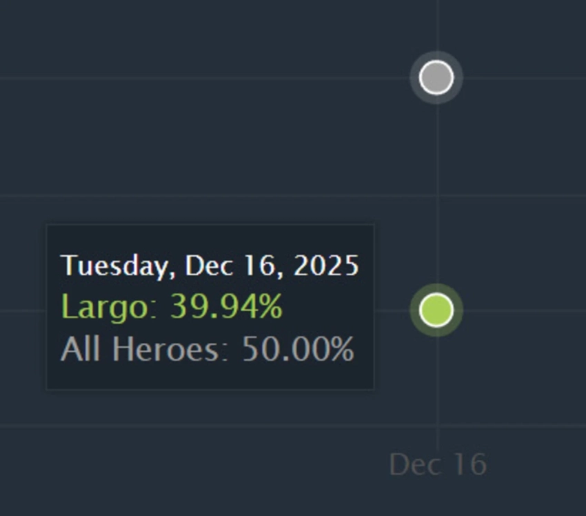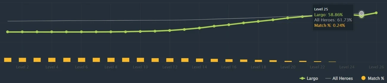 Статистика подтверждает, что эффективность персонажа растет вместе с прокачкой, как и у большинства героев. При достижении 25-го уровня доля побед Largo увеличивается до 58,8%. Тем не менее, даже этот результат ниже среднего показателя по игре, который составляет 61,7% для персонажей на поздней стадии матча.