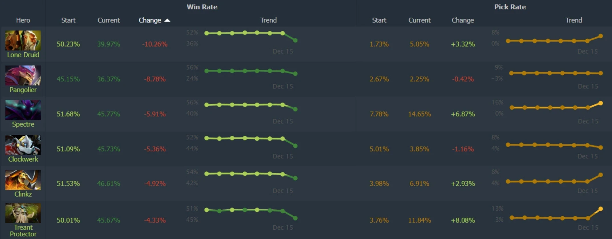 Персонажи с наибольшим падением победных серий в патче 7.40, Источник: Dotabuff