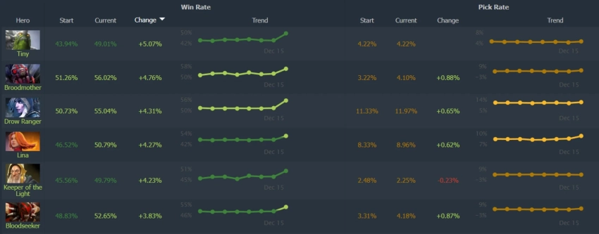 В то время как сложные персонажи теряют популярность из-за переработок, герои с минимальными изменениями вырываются вперед. Лидерами по росту винрейта стали Tiny, Broodmother и Drow Ranger. Им достались лишь незначительные улучшения способностей, что на фоне ослабления конкурентов сделало их более надежным выбором для поднятия рейтинга.