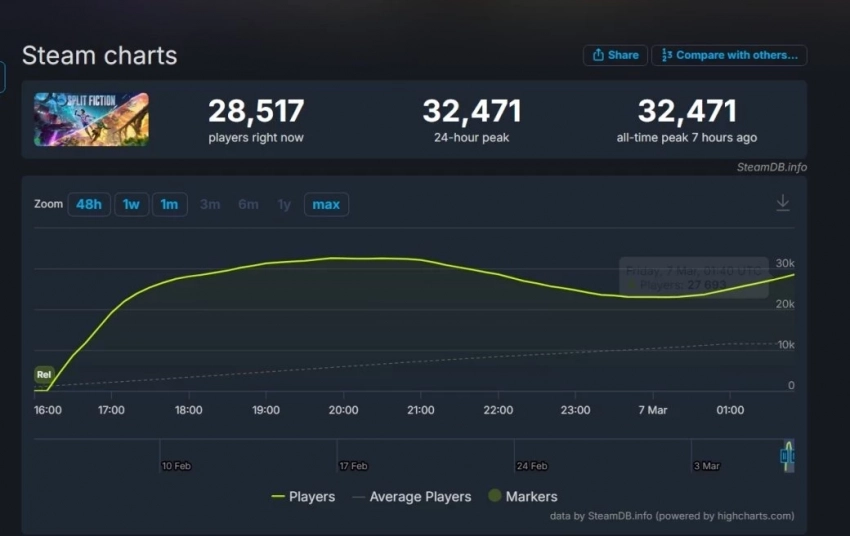 Поэтому заглянем в Steam. Здесь пиковый онлайн новинки достиг 32 471 игрока одновременно. Это ставит Split Fiction между It Takes Two (71 039 игроков) и A Way Out (8 582 игрока).