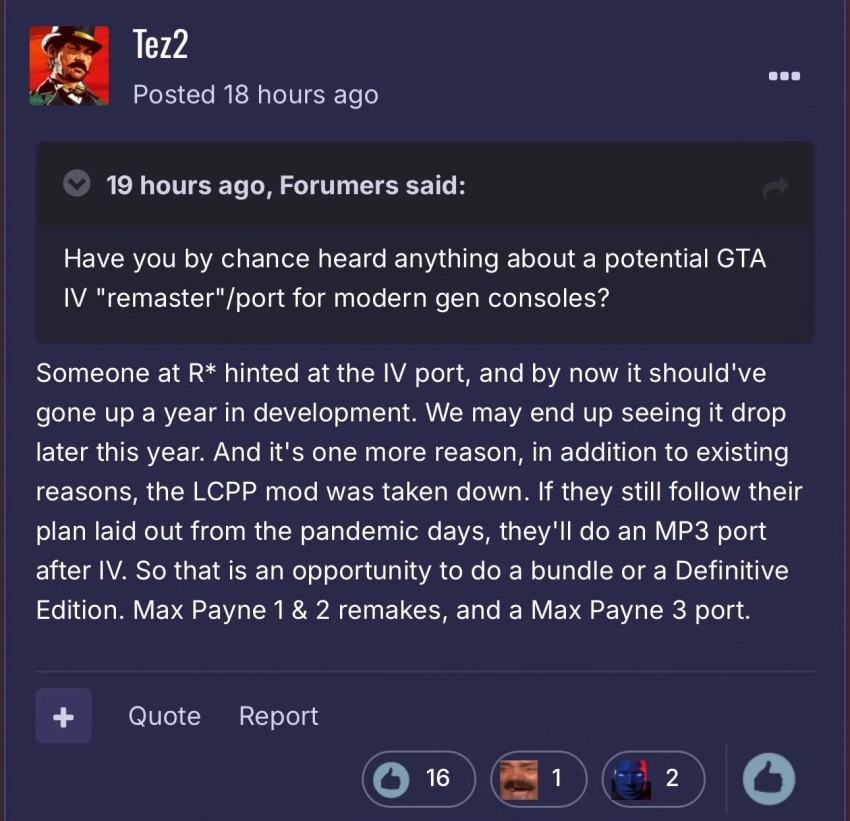 Более того, Tez2 уверяет, что Rockstar после порта GTA IV создаст и схожий порт Max Payne 3. Подобная инициатива позволила бы разработчикам выпустить набор или Definitive Edition с играми серии Max Payne: ремейками двух первых частей и обновлённой третьей.