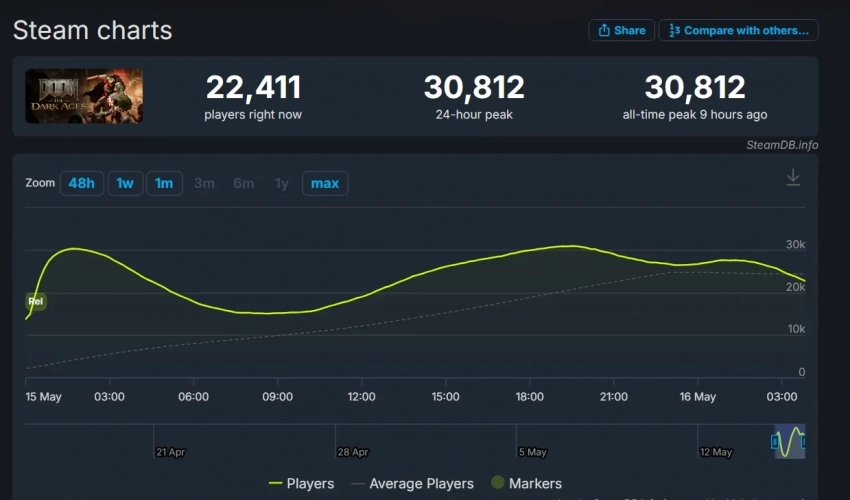 Пиковый онлайн DOOM: The Dark Ages в Steam тоже не особо вырос — с 30 232 до 30 812 игроков одновременно. Напомним, что у: