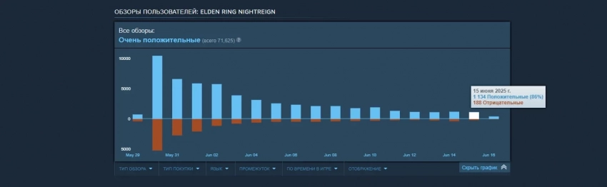 Например, за 15 июня было написано 1134 положительных обзора, а вот негативную оценку Elden Ring Nightreign получила лишь от 188 пользователей. В отрицательных рецензиях игроки ругают неудобное управление, отсутствие разнообразие в скинах персонажей, проблемы с производительностью и частые вылеты. Кому-то Nightreign не пришлась по душе из-за схожести с оригинальной Elden Ring — такие геймеры считают, что купили «дополнение» по стоимости полноценной игры.
