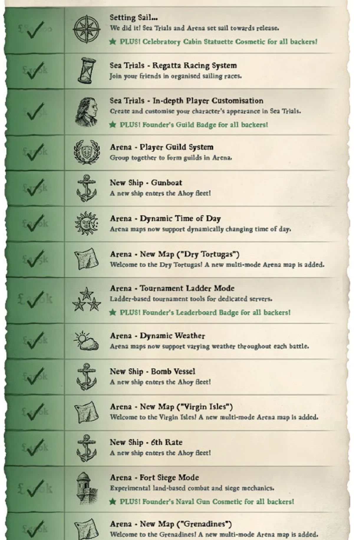 Наивысшей целью в Capstan Games назвали сбор почти 878 тысяч долларов — за достижение этой цели игроки бы получили социальный хаб для общения с друзьями и отдыха между морскими сражениями. Также собранных средств не хватило для добавления дуэлей в режиме арены, ещё одной карты и «специального» оружия — гранат, трёхствольных пистолетов и не только.