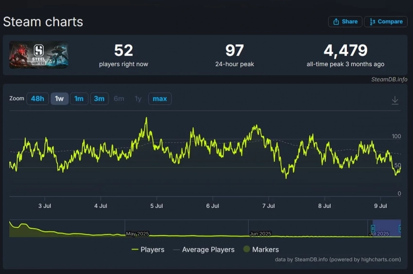 Она находится в раннем доступе Steam с апреля этого года. Пиковый онлайн составил 4 479 игроков одновременно. В мае — 651 человек. А затем всё ниже и ниже. Пиковый онлайн за последние сутки — всего 97 игроков одновременно.