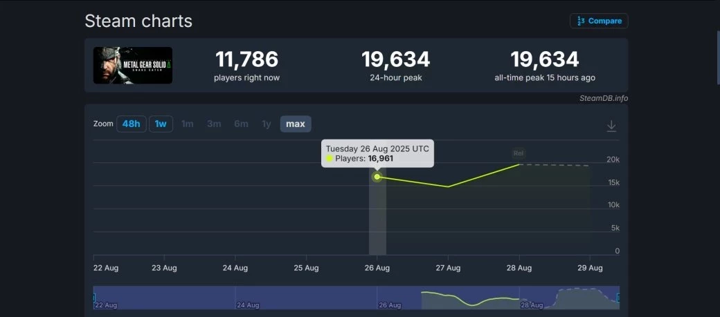 Зато ремейк Metal Gear Solid 3: Snake Eater смог превзойти Metal Gear Rising: Revengeance (12,2 тысячи игроков на пике), а также все остальные части серии, доступные на PC в Steam. Например, оригинальная третья часть в издании Master Collection на пике собрала чуть более 1,2 тысячи человек.