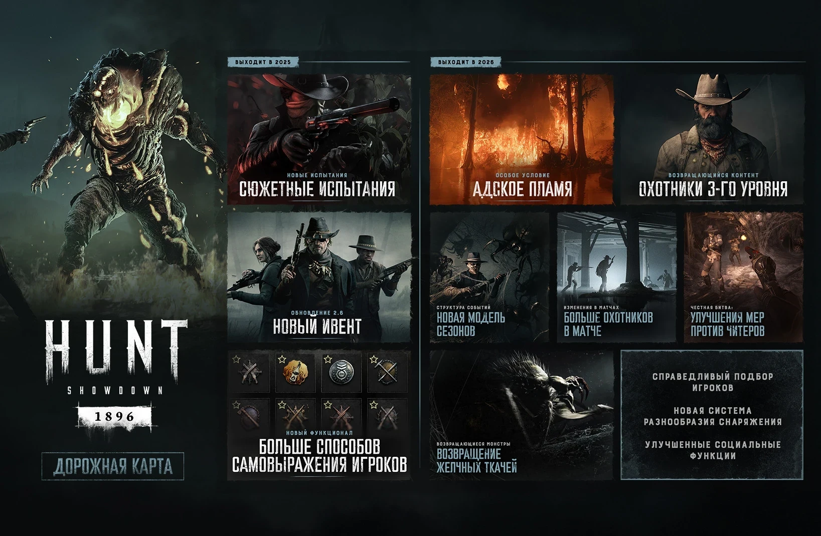 До конца 2025 года бойцов Hunt: Showdown 1896 ждут новые сюжетные испытания и больше возможностей для кастомизации. Также в обновлении 2.6 прибудет новое временное событие. А вот 2026 год будет построен на следующем фундаменте: дать игрокам больше способов жить, сражаться и выражать себя. Это подразумевает углубление «стратегической и тактической песочницы».