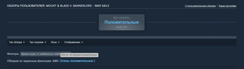 Первые оценки Mount & Blade II: Bannerlord — War Sails в Steam оказались очень положительными: 90% одобрения на основе 133 обзоров.